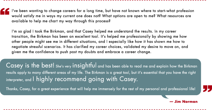 Not sure of the results, or what the results even meant, I went in and finally got the chance to meet Casey. I can confidently say that the two plus hours I spent with Casey reviewing my Birkman results were the most interesting and enjoyable two hours I've had in many months. Casey went over the results with me, point by point, and thoroughly explained what they meant and how I could apply them to my search for employment. Overall, the experience of the Birkman was edifying and Casey made it enjoyable.